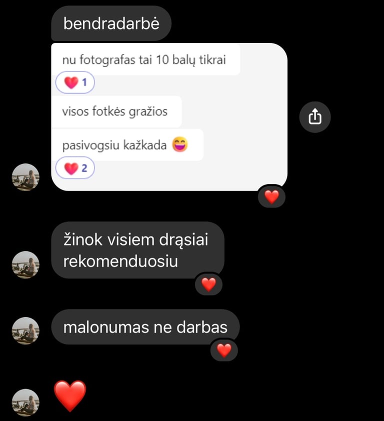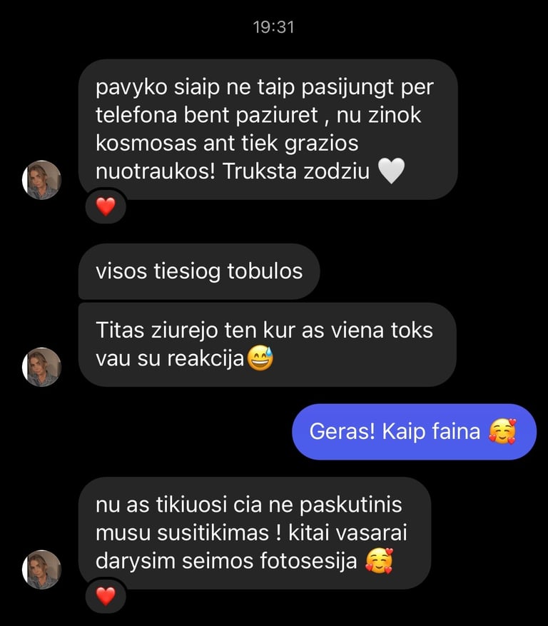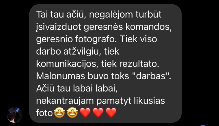 Jei norite paprastų, tradicinių, nuobodžių ir supozuotų nuotraukų, tada aš nesu jums tinkamas fotografas. Siekiate išskirtinumo, unikalumo ir nenorite gailėtis savo pasirinkimo po daugėlio metų žiūrėdami į nuotraukas? Turbūt kartu esame teisingame kelyje! Mano fotografijos stiliuje susijungia dokumentika ir natūralios spalvos, įkvėptos gamtos ir kino filmų, suteikiant jūsų nuotraukoms unikalumo ir ilgaamžiškumo. Skamba daugmaž tai ko ieškote? Pakalbėkime ;)